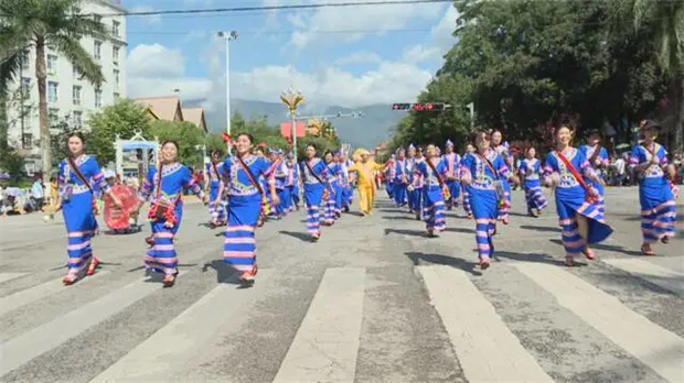 )組成的多個民族文化方陣巡游隊伍,從縣人民政府大院出發,沿著震新路向勐相濕地公園緩緩前進。